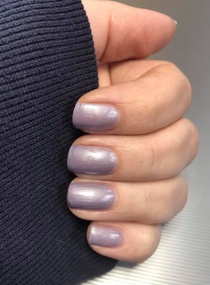Lavender grey. Pearl finish. Light. Opaque. Warm undertone.