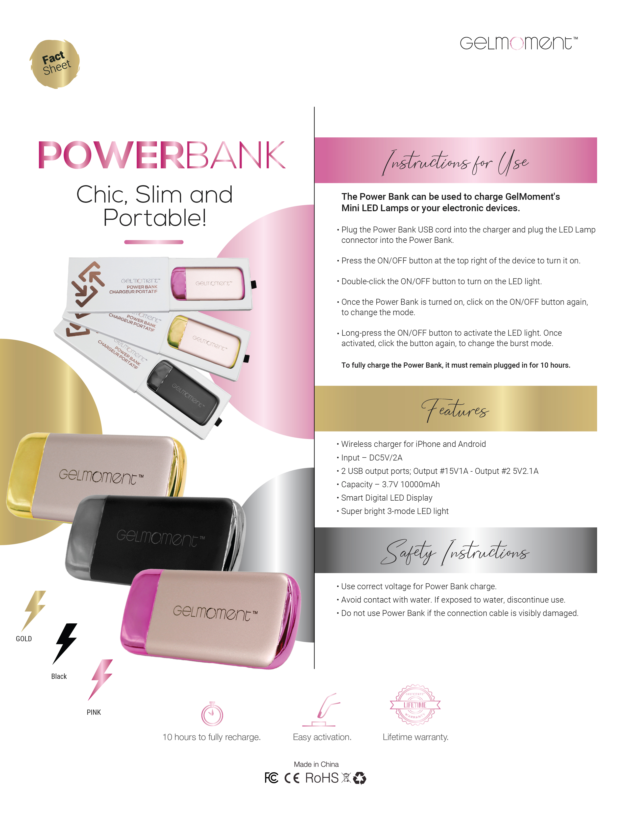 Available with either pink or gold accents, this GelMoment branded Power Bank will be an eye-catching conversation starter wherever you go. Perfectly sized to fit into your Beauty Bag, purse, or the pocket of your favourite jeans, this Power Bank packs a punch!