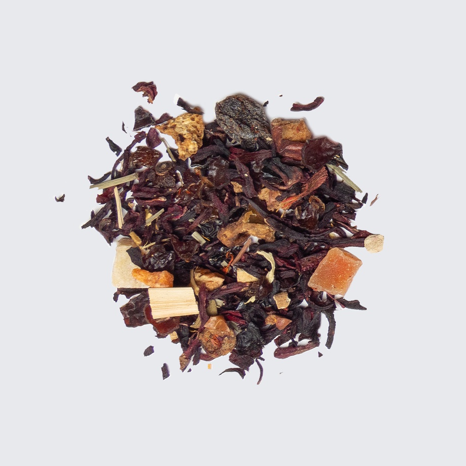 Hibiscus, pineapple, papaya, raisins, rose hips, apples, orange, lemongrass, licorice, ashwagandha, ginger, orange mango extract, marigold, safflower.