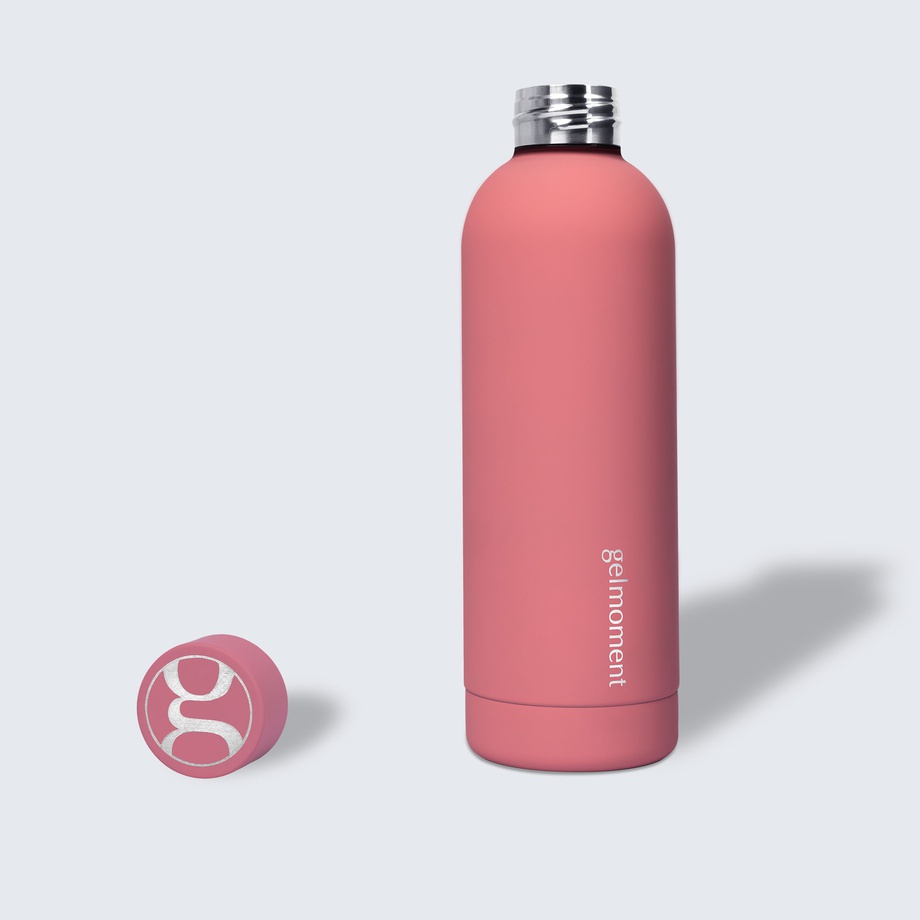 An additional plus of our water bottles is their distinct design. They’re available in two colours—matte pink & matte black—both tastefully branded with the gelmoment logo along the side & on the cap. The matte finish is super soft, and adds such a gorgeous, unique touch to this indispensable product.